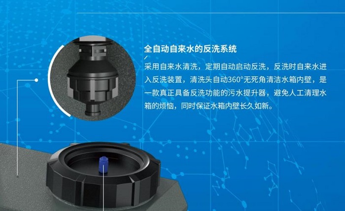 智流研發的污水提升器自來水反清洗系統,預留了自來水接入口,直接引入自來水來清洗,箱體內置360°高壓旋沖噴頭,360°無死角清洗箱體內壁,不留死角。